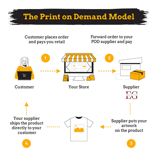 We offer Print on Demand (POD) service to clothing brands using good quality t-shirts, prints and shipping service.
